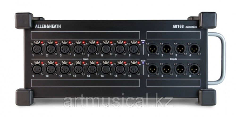 AB168 – Stagebox (Audio Racks) для цифровых микшерных пультов от ALLEN & HEATH. Позволяет расширить количество физических входов и выходов на разъемах XLR. соединяется с пультом по протоколу Cad 5 через разъем dSnake (RJ45). Такой способ коммутации, позволяет передавать сигнал без задержек и сбоев на расстояние до 120 метров. Также, есть возможность последовательно соединить несколько Stagebox, для этого предусмотрен дополнительный вход Expander.