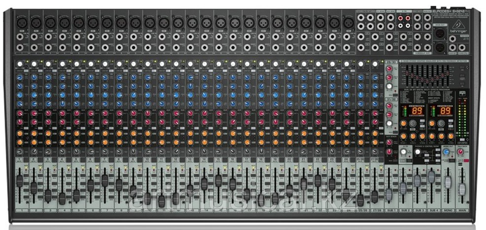 Behringer EURODESK SX3242FX – это профессиональный студийный 32-канальный аналоговый микшер с малошумящими микрофонными предусилителями XENYX. Они позволяют использовать как динамические, так и конденсаторные микрофоны. На входах находятся трехполосные полупараметрические «британские» эквалайзеры с двумя ручками регулировки нижних частот (помимо верхних и средних), на микрофонных каналах – обрезные НЧ-фильтры 80 Гц. У устройства 4 шины: можно собрать сигналы с одного или нескольких каналов на любую из них. Еще одна отличительная черта микшера – два встроенных процессора эффектов с разрешением 24 бит, оба можно применить к любому каналу независимо друг от друга. Процессоры обладают двумя двухсегментными цифровыми ЖК-дисплеями для отображения выбранной предустановки и ее параметров.